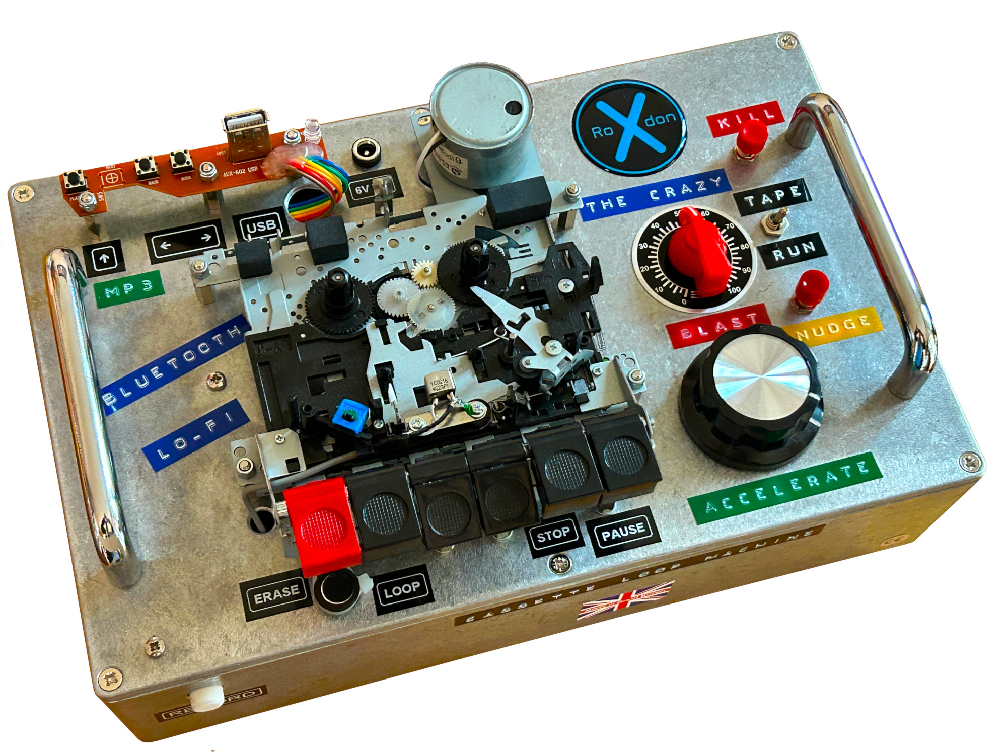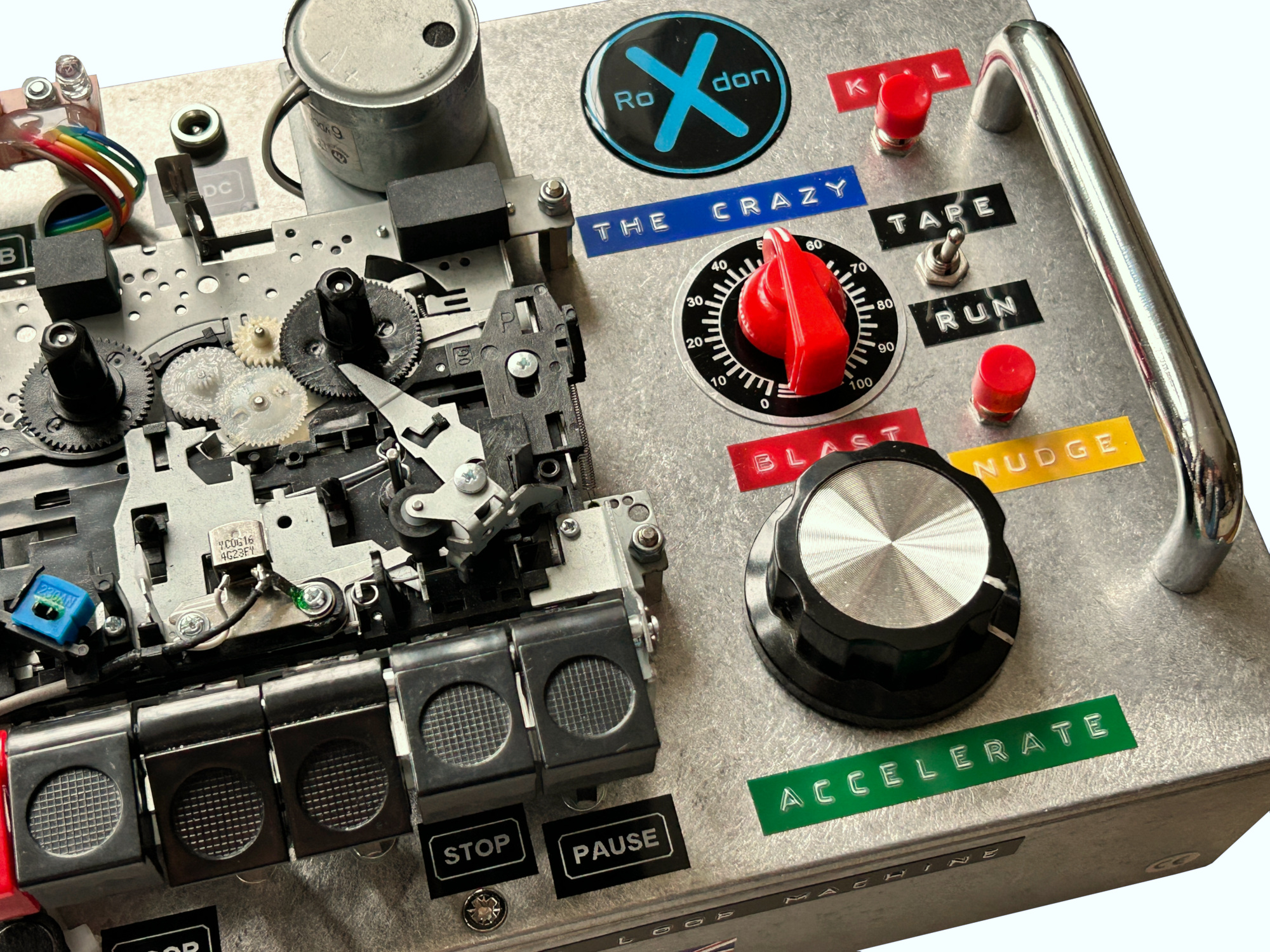 RoXdon THE CRAZY Cassette Loop Tape Machine The RoXdon THE CRAZY LoFi Cassette Loop Tape Machine has been designed to easily create Cassette Loop Tapes from various audio inputs. Nothing else on the planet can achieve what the RoXdon THE CRAZY can do. Truly a Crazy device in looks and functionality! Using a