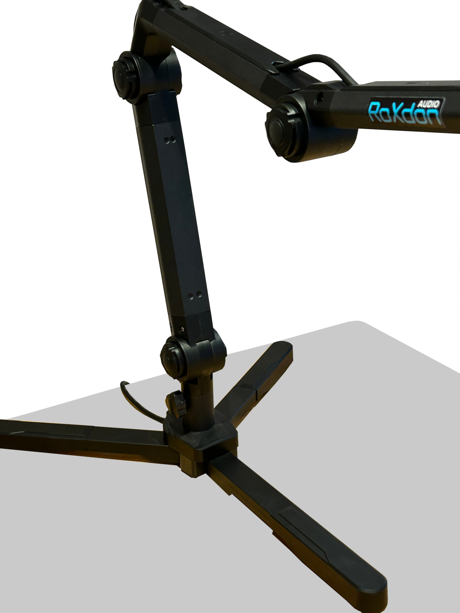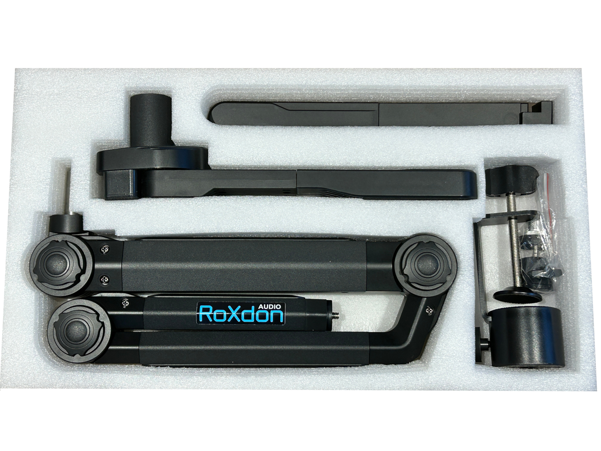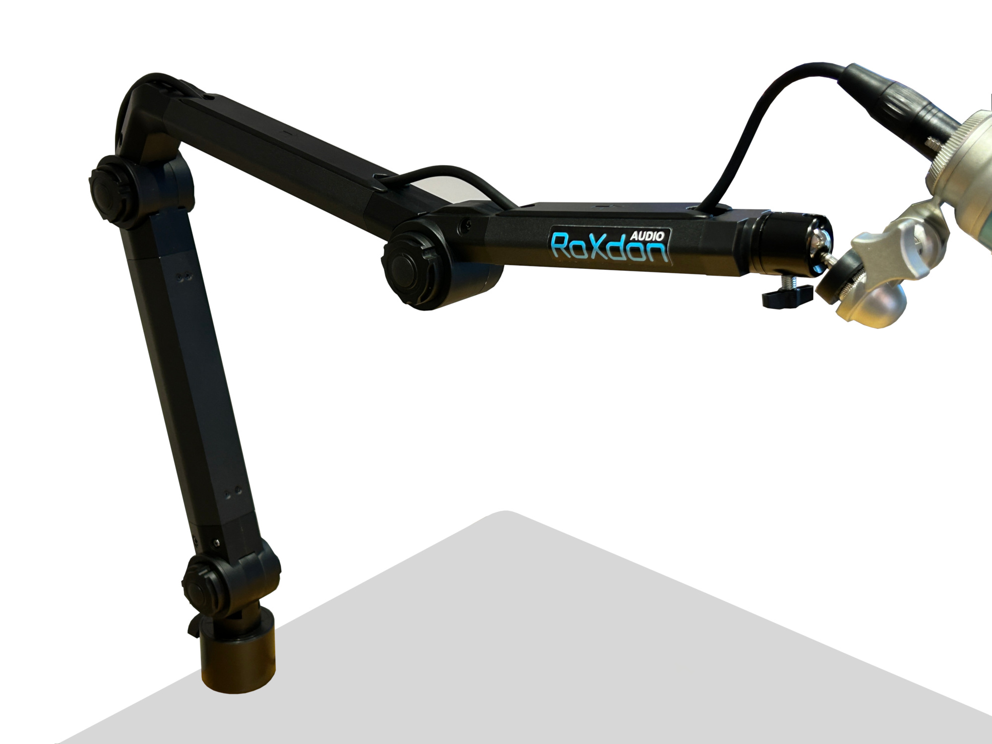 RoXdon ON-AIR Broadcast Microphone Stand The new RoXdon ON-AIR desktop broadcast microphone stand is built to an extremely high standard, expected by professional Broadcasters. Suitable for Radio Stations, Podcast Studios and serious Gamers, the ON-AIR mic stand is fully adjustable using the large quick release buttons on the three arm joints. The microphone or shock mount connection part utilizes a swivel ball joint for accurate positioning and is fully lockable ensuring your microphone placement stays put. Each arm of the RoXdon ON-AIR stand has a removable cable slot cover allowing the connection cable to be hidden, an important feature maintaining a quality visual appearance. Supplied with a heavy duty 'C' clamp for mounting on a desk edge or the optional tripod stand. FEATURES