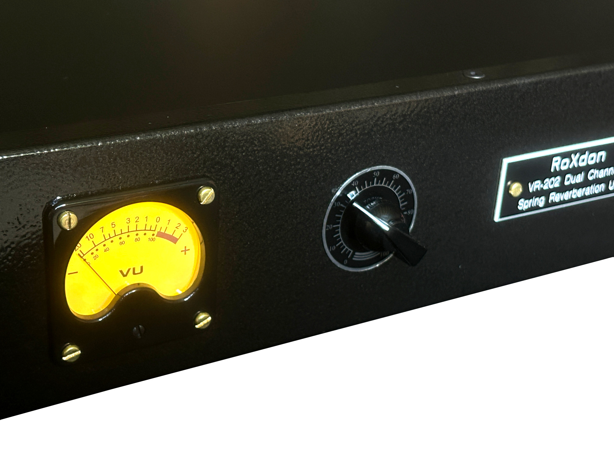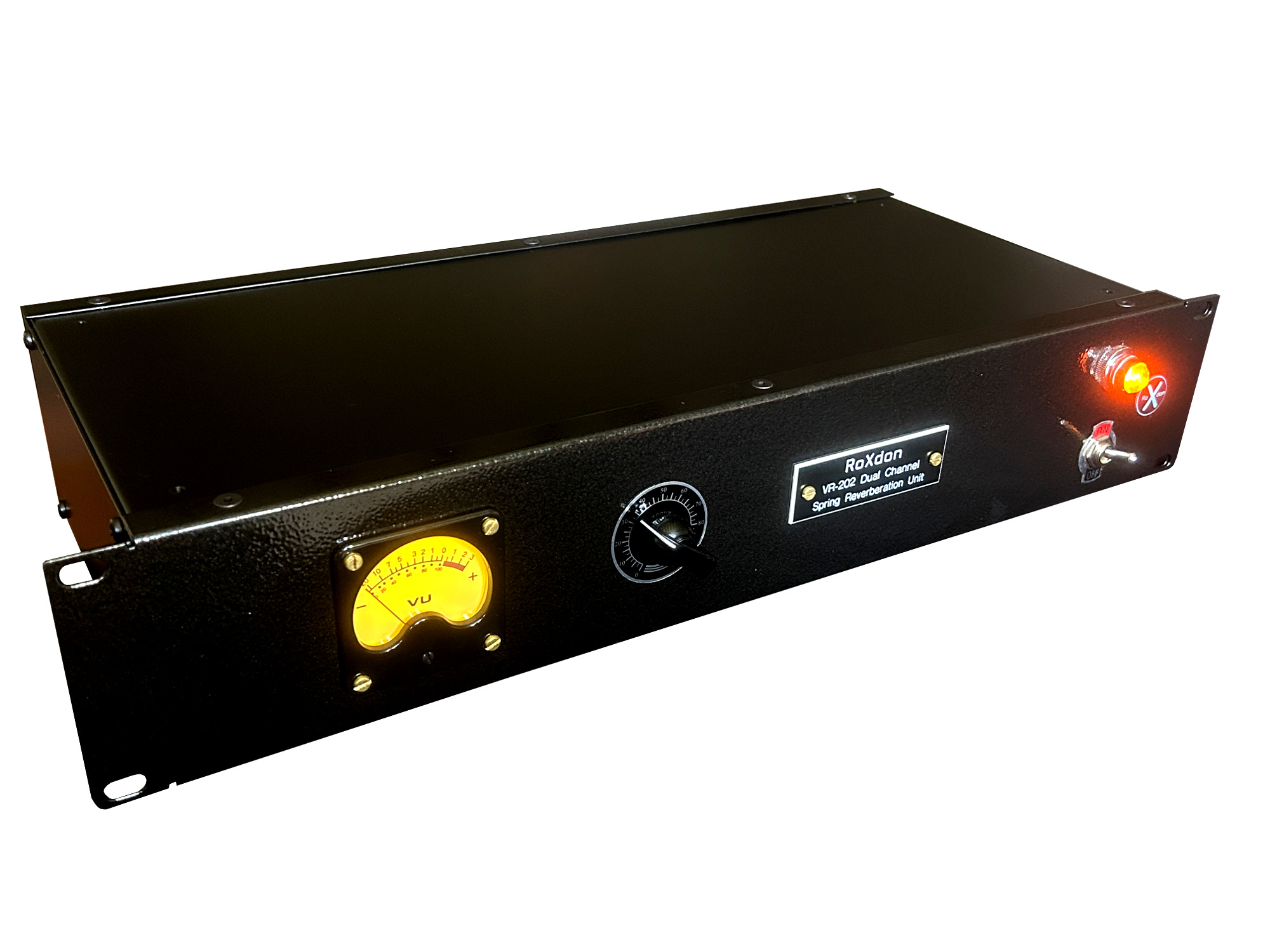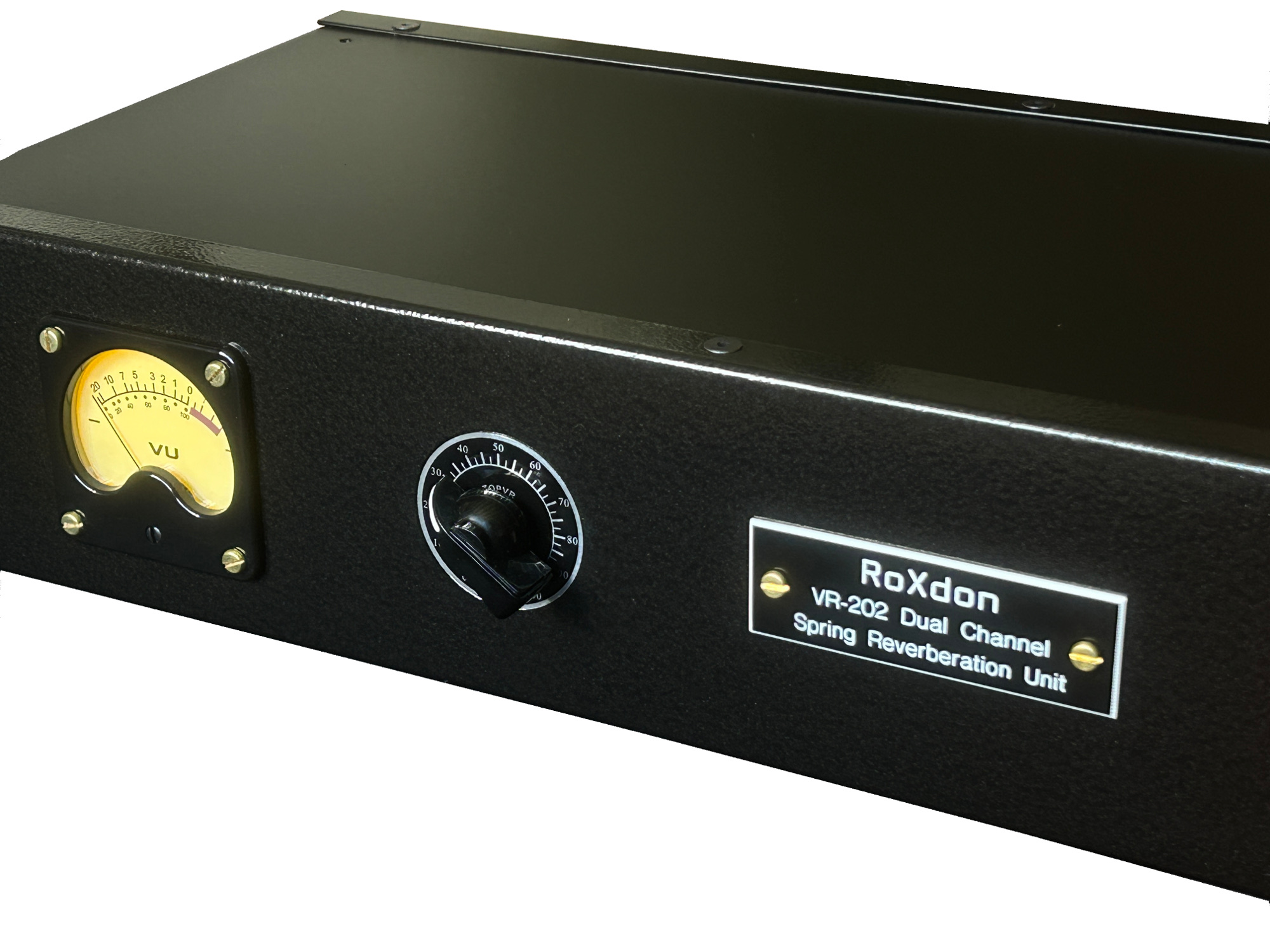 BRITISH HANDBUILT STUDIO EFFECTS The RoXdon VR-202 Spring Reverberation Unit is a dual input classic analogue spring reverberation unit designed for use with a studio sound mixer or line level source. The VR-202 is a rack mounted clone of the classic vintage 1970's Pioneer SR-202 used by Tom Elmshirst for Adele, Amy Winehouse and Mark Ronson and heard famously on Adele's vocal on 'Rolling In The Deep'. The RoXdon VR-202 is completely hand assembled in small batches, in London, England. The VR-202 signal path uses only discrete components like transistors, resistors and capacitors, with no integrated circuits. The subjective sound quality delivered by these classic vintage designs is often preferred over the sound of modern digital units and software created reverb delays. Particularly useful on vocals, the smooth, dark sounding, natural effect needs little manipulation other than adjustment of the intensity to create a lush mix ready vocal performance. The heart of the VR-202 is the mono 3-spring vintage replica reverb tank. The spring transducers are wired direct to the audio circuit board using screened cable. This makes the 'tank' less receptive to interference. Also close attention has been paid to the spacing and size of the transducer laminations resulting in a more vintage like tone. The double sided audio printed circuit board is hand soldered and features WIMA capacitors, carbon resistors and low noise transistors. All connections to the internal Audio Board are via soldered terminal posts, the way it used to be. The supplied external International 24volt DC regulated power adapter provides clean power to the VR-202 ensuring transformer magnetic fields are not present inside the chassis which can induce noise onto the sensitive spring tank. The power is 'cleaned' further by the inclusion of a ripple filter on the audio circuit board. The RoXdon VR-202 features a steel 2U 19" rack mounted enclosure manufactured with vintage black hammered finish front panel, retro style reverb intensity knob, dial, on/off switch and power-on lamp. The front panel also includes a convenient illuminated VU meter which provides a visual guide to the input signal level. The rear panel has a 24 volt DC socket for connection of the external power adapter (supplied) and 1/4" line input and output jack sockets for connection to a sound mixer or line level source. OPERATION When using the RoXdon VR-202 as a stereo reverb unit a left and right summed mono line level signal is fed to the side-chain drive amp circuit which drives the reverb spring. The delayed reverberation signals are then mixed with the left and right clean input signals equally. This circuit design emulates a 'real life' reverberation where the reflected sound waves come from all directions. When a mono reverb delayed signal only is required, eg. using mixer channel AUX, this can be accessed by using INPUT L together with OUTPUT R.